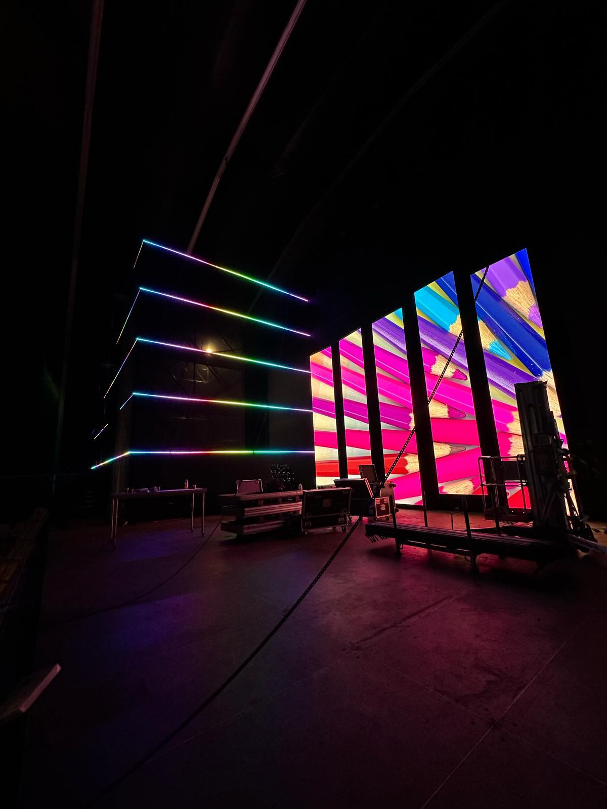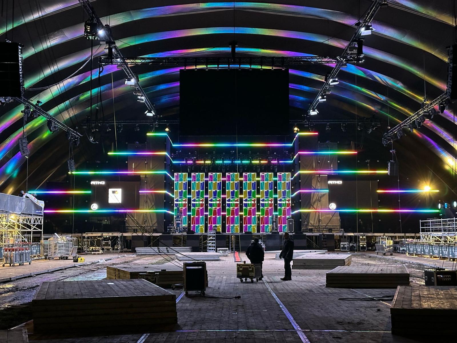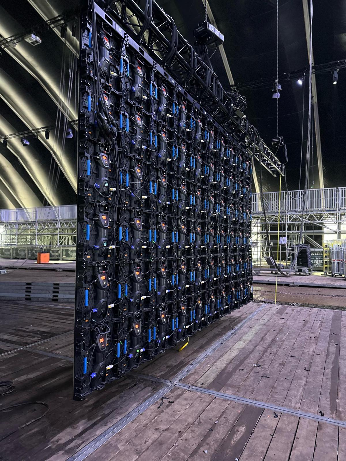 105 m² aan ledschermen (backdrop in 5 stroken, 2 side screens en 1 delay screen).