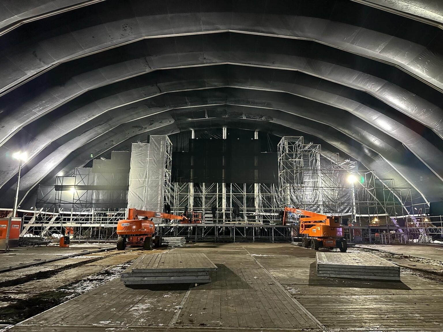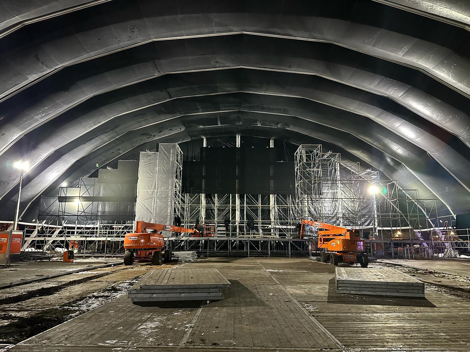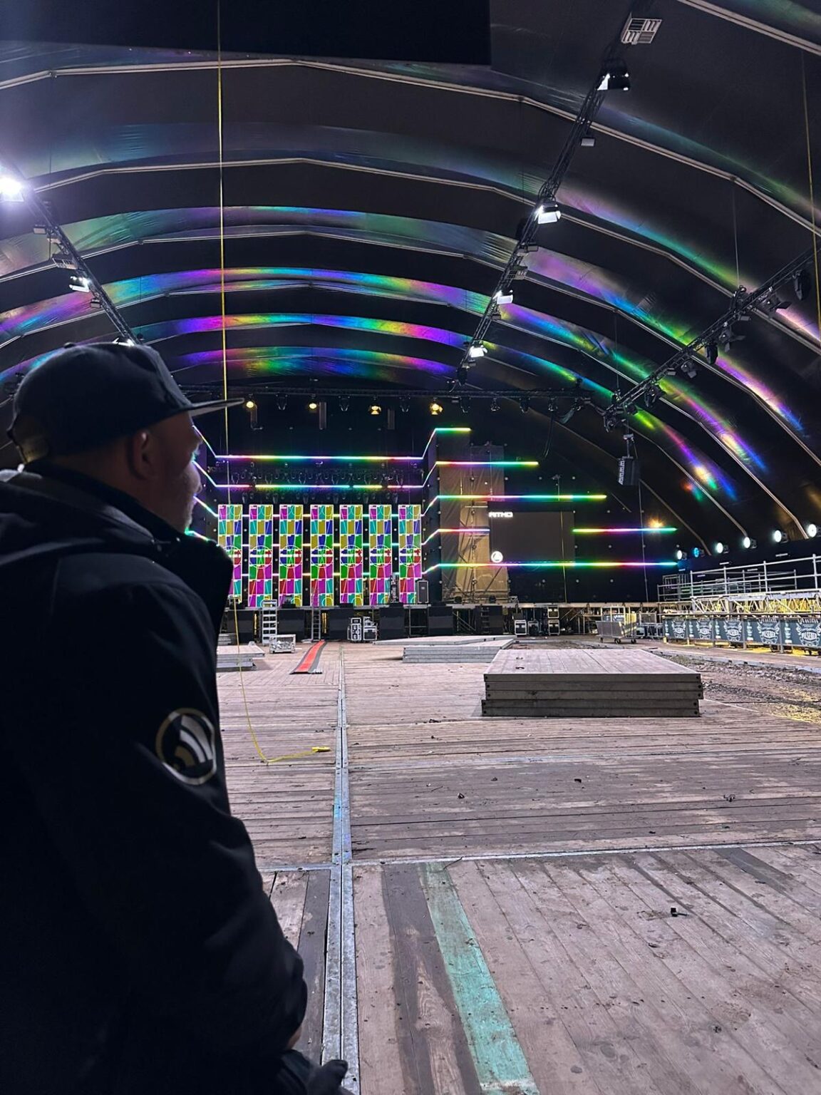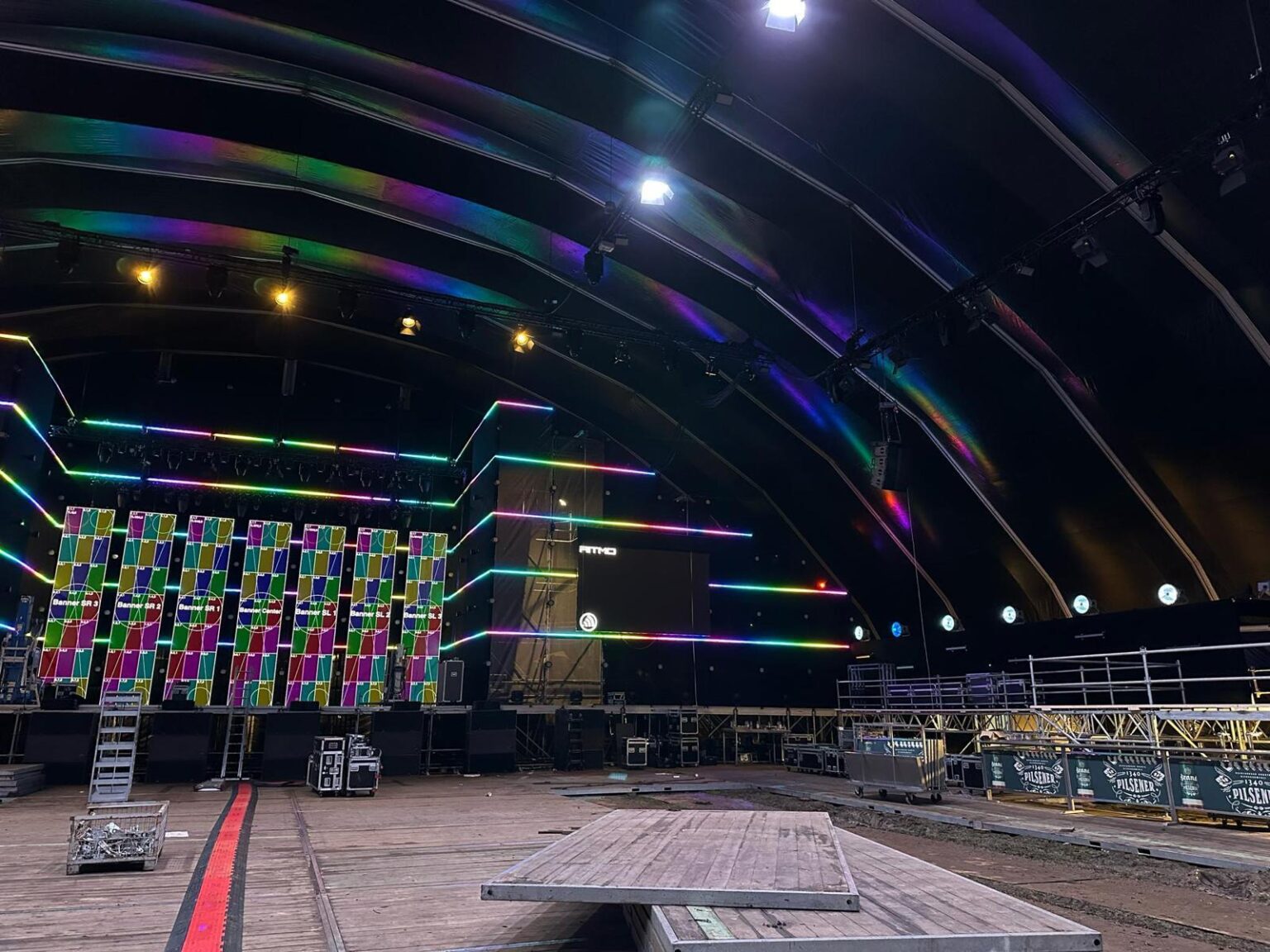 105 m² aan ledschermen (backdrop in 5 stroken, 2 side screens en 1 delay screen).